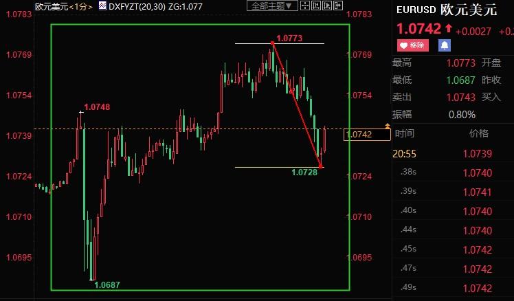 稍早前,欧洲央行公布新政,如期维持三大关键利率不变,但大幅上调通胀预期并下调经济增速预期。欧元兑美元探底回升逾55点。
