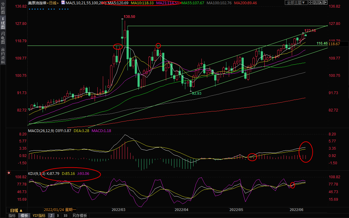 日线级别:震荡上涨;MACD金叉,KDJ金叉,均线多头排列,油价有效突破了3月24日高点116.64附近阻力,并初步顶破了120整数关口,后市偏向延续涨势,有望进一步试探3月份触及的多年高点130.50附近阻力,从价格测算来看,油价中线有望涨向140关口附近。短线的话,3月9日高点126.84附近也还存在一些阻力。