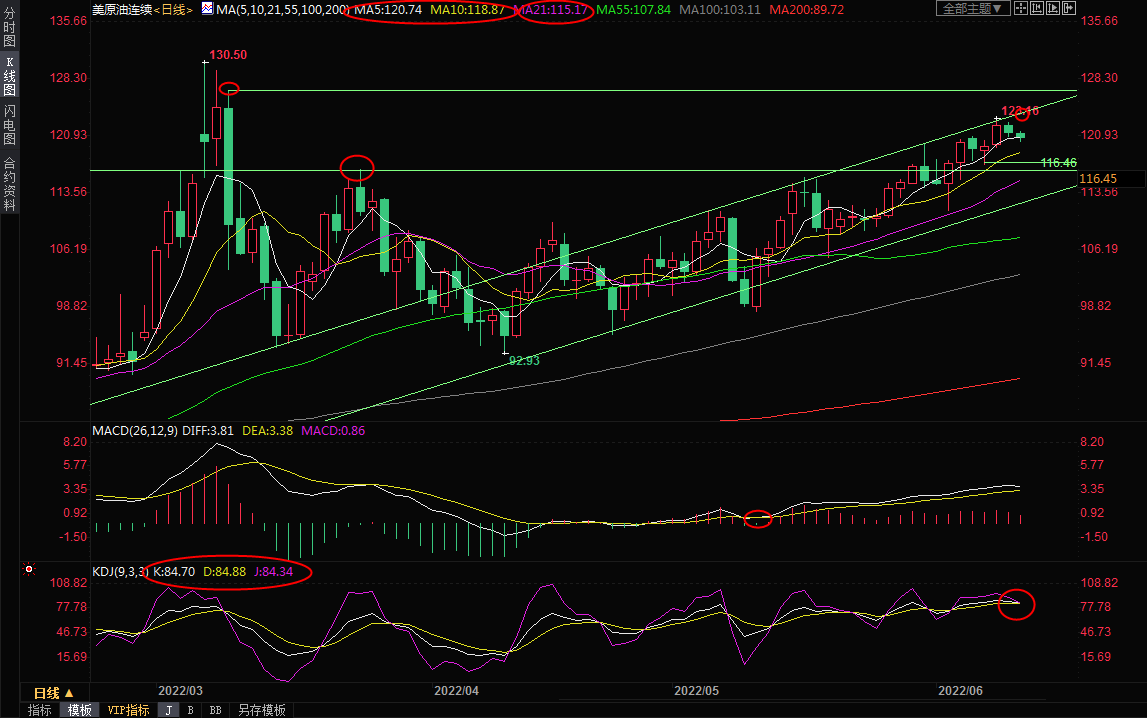 日线级别:震荡上涨;油价在上涨通道上轨附近遭遇了一些阻力,KDJ超买区有死叉趋势,需要提防油价短线进一步回调风险,初步支撑在120整数关口,然后是10日均线118.88附近支撑,如果失守该位置,则增加短线看空信号,进一步较强的支撑在3月24日高点116.64附近。