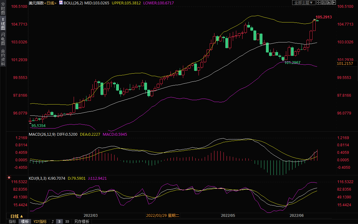 追踪美元兑其他六种主要货币表现的美元指数上涨0.9%,收报105.21,盘中最高触及105.29,为2002年12月以来最高。