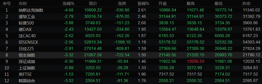 美股收盘情况,道琼斯工业指数下跌876.05点,或2.79%,至30516.74点;标普500指数下跌151.23点,或3.88%,至3749.63点;纳斯达克指数下跌530.80点,或4.68%,至10809.23。