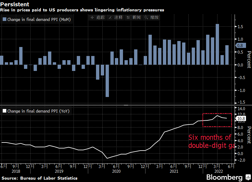 美国5月生产者物价指数飙升,凸显整个经济当中通胀压力持续存在,有可能会令美联储继续激进地加息。