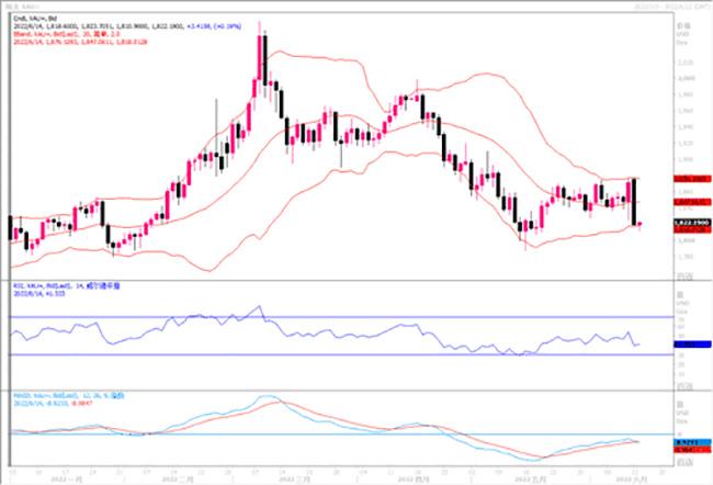 周一早间金价最高上探1879一线后短线维持偏温和震荡下行,欧美交易时段,金价则开启了加速走低交易行情,一路抵近1817美元水平,周二早间金价更是加速走低最低下探1809一线。技术图形上,日线录得实体柱较为强劲阴线,短期金价再度形成对日线200日均线向下破位走势,随着报价区间走低日线移动平均线呈向下交叉粘合形态,出现了震荡偏空的指引参考。小时线显示,短期金价大幅走低带来小时线较为规整向下发散偏空排列形态,但小时图上的技术指标均有超卖调整的需求,如果金价回不到前期震荡区间底沿水平线1830之上,则要小心黄金继续下探,若跌破1800整数大关,下方支撑落在1786美元水平。