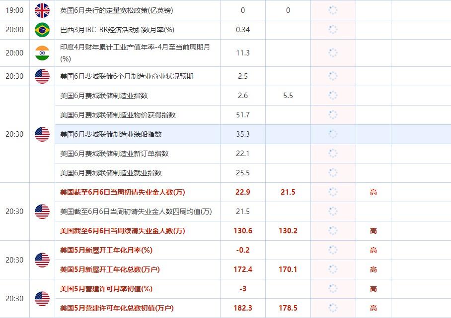 20:30 美国截至6月6日当周初请失业金人数(万) , 前值 22.9 , 预期值 21.5 , 公布值:待发布