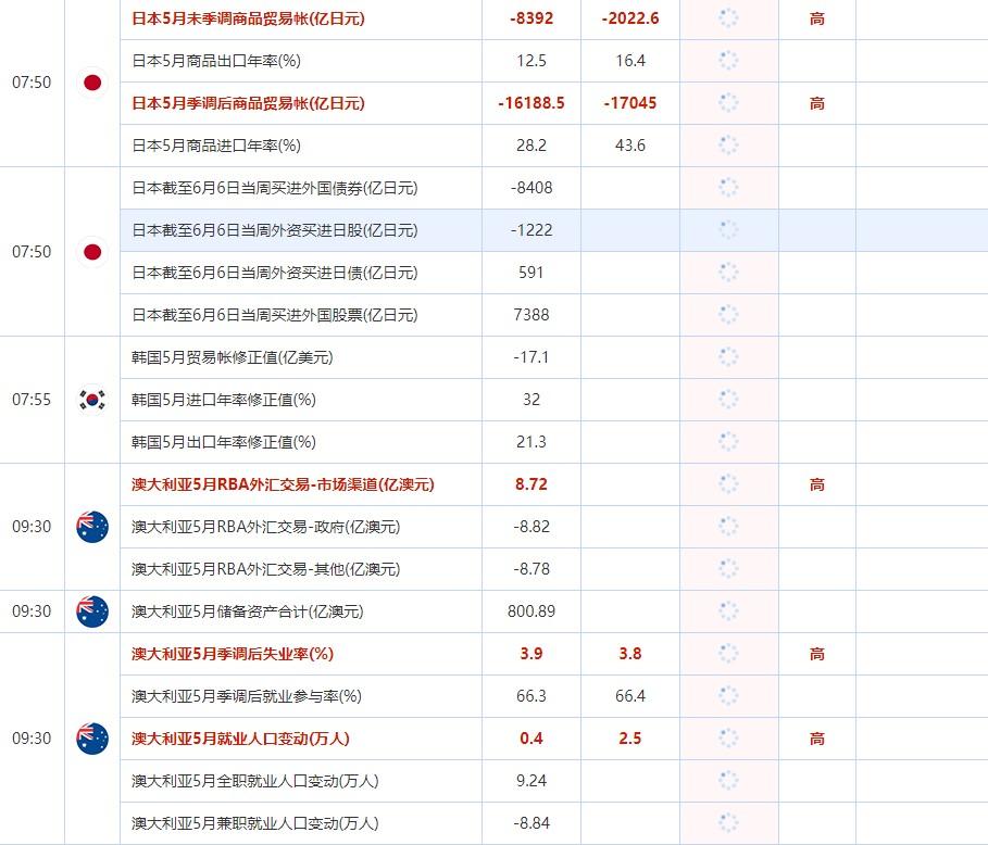 07:50 日本5月季调后商品贸易帐(亿日元) , 前值 -16188.5 , 预期值 -17045 , 公布值:待发布