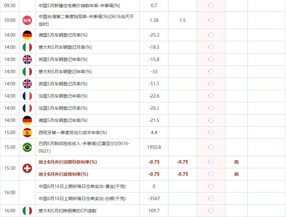 15:30 瑞士6月央行活期存款利率(%) , 前值 -0.75 , 预期值 -0.75 , 公布值:待发布