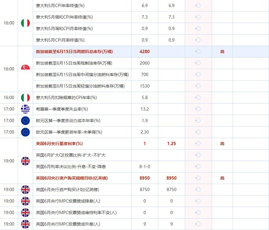 19:00 英国6月利率决议比例-升息-不变-降息 , 前值 8-1-0 , 预期值 -- , 公布值:待发布