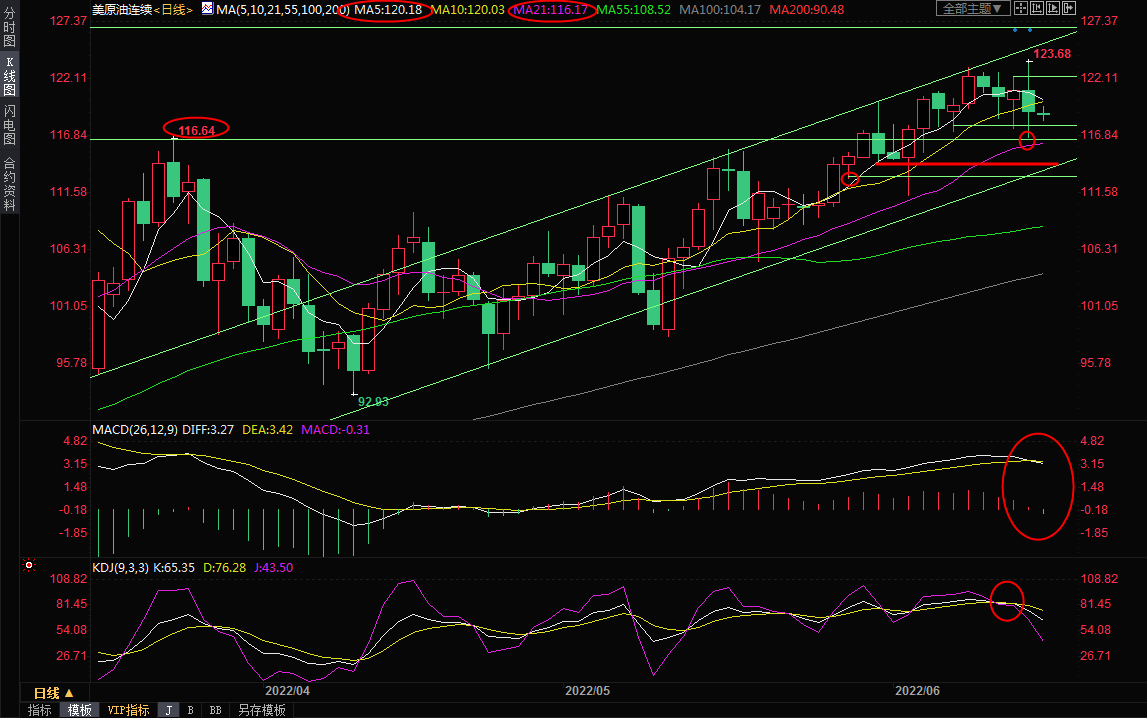 上方初步阻力在5日均线120.18附近,6月13日高点阻力在122.25附近,若能收复该位置,则增加短线看涨信号。
