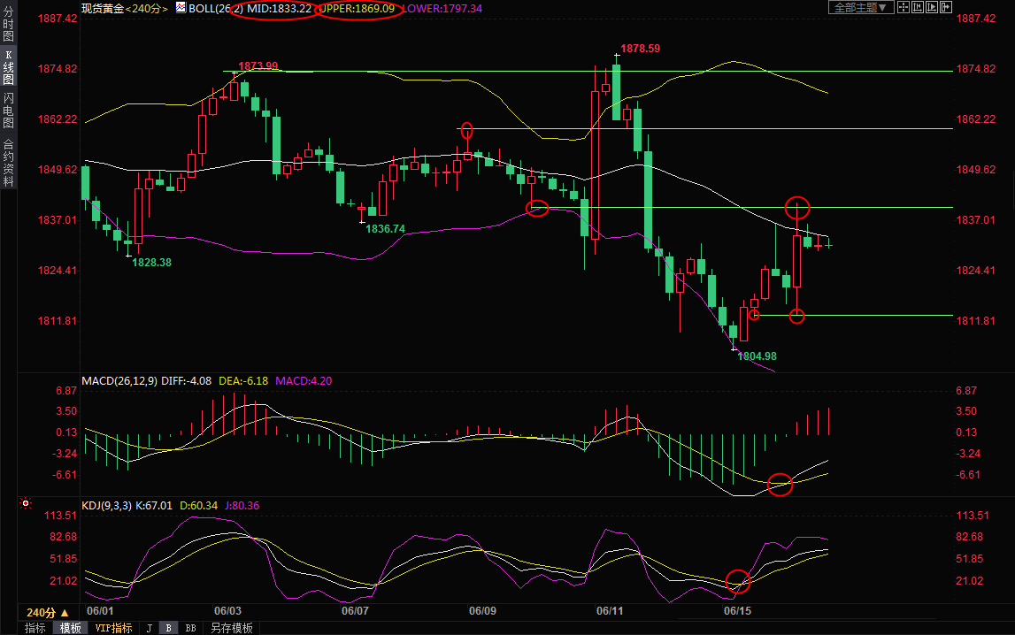 4小时级别:震荡下跌后反弹;MACD金叉,KDJ金叉,短线略微偏向多头,目前正试探布林线中轨附近阻力,大约在1833附近,一旦顶破该阻力,则增加短线看涨信号,进一步阻力在隔夜高点1841.70关口附近,然后是1859.50附近阻力。当然,1850关口也可以稍微留意一下。