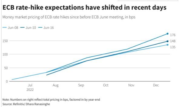 货币市场目前预计,到2023年7月,欧洲央行将累计加息272个基点,届时基准利率将达到约2.1%。相比之下,在6月初,市场对欧洲央行到2024年初的利率定价仅有1.5%。