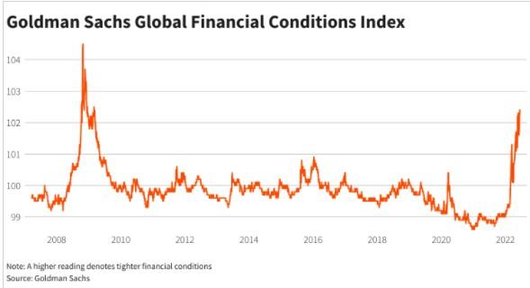 根据高盛编制的一项指数显示,利率上升、油价飙涨和金融市场动荡,都造成了2009年以来最紧张的金融状况。高盛利用汇率、股市波动和借贷成本等指标,编制了当前市场上使用最广泛的金融状况指数。