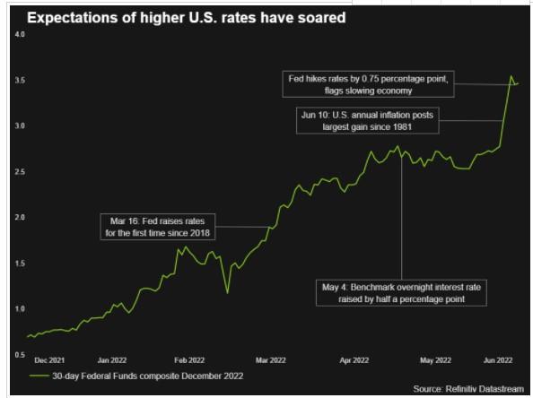 这一市场预期其实已经与美联储自身制定的利率点阵图预测较为接近。6月的最新点阵图显示,美联储官员们预计,到12月利率将升至3.4%,到2023年底将升至3.8%,这将是自2008年初美国经济处于金融危机风口浪尖以来的最高水平。