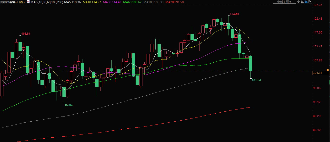 商品收盘方面,布伦特原油期货下跌2.5%,报收每桶111.74美元。这一全球指标原油价格盘中触及107.03美元,为5月19日以来最低。美国原油期货大跌3%,结算价报每桶106.19美元。盘中低见101.53美元,为5月11日以来最低。美国期金收于1838.4美元。