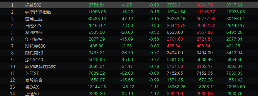 美股收盘情况,道琼斯工业指数下跌0.15%,报30483.13点;标普500指数下跌0.13%,报3759.89点;纳斯达克指数下跌0.15%,报11053.08。