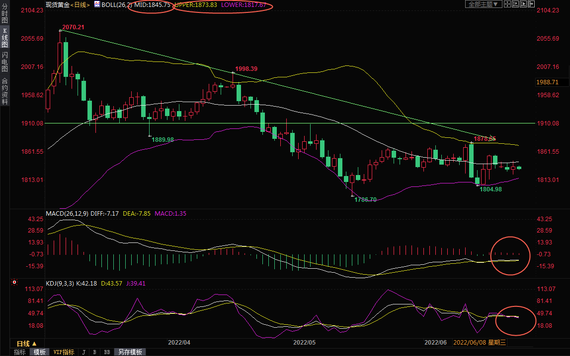 目前金价位于多数均线和布林线中轨下方,在顶破布林线中轨1845.77前,后市略微偏向震荡下行。如果跌破布林线下轨支撑,则增加短线看空信号,后市有望进一步试探1800整数关口和5月份低点1786.70附近支撑。