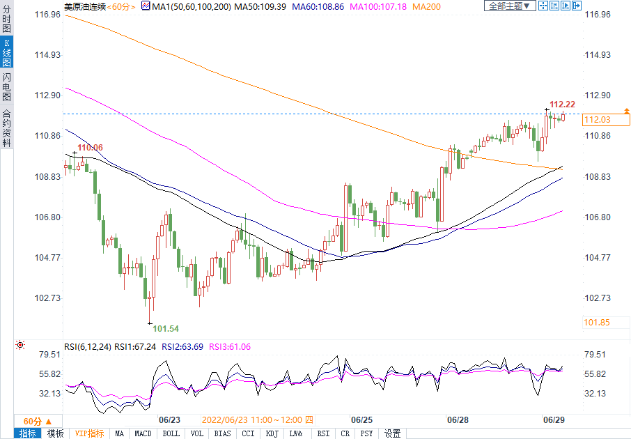 周二(6月27日)布油期货上涨2.5%,结算价报每桶117.58美元。全球产量面临的威胁给现货市场火上浇油,同时七国集团同意研究给俄罗斯石油设定价格上限,油价再度收涨。早前公布的API数据显示,截至6月24日当周,原油库存大减379.9万桶,汽油和精炼油库存分别意外增加285.2万桶,261.3万桶。