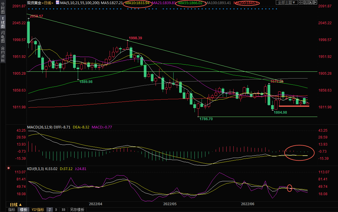 上方10日均线阻力目前在1833.84附近,200日均线阻力在1845.50附近,若能顶破该阻力,则增加短线看涨信号;进一步阻力在6月16日高点1857.39附近;55日均线阻力在1866.00附近。