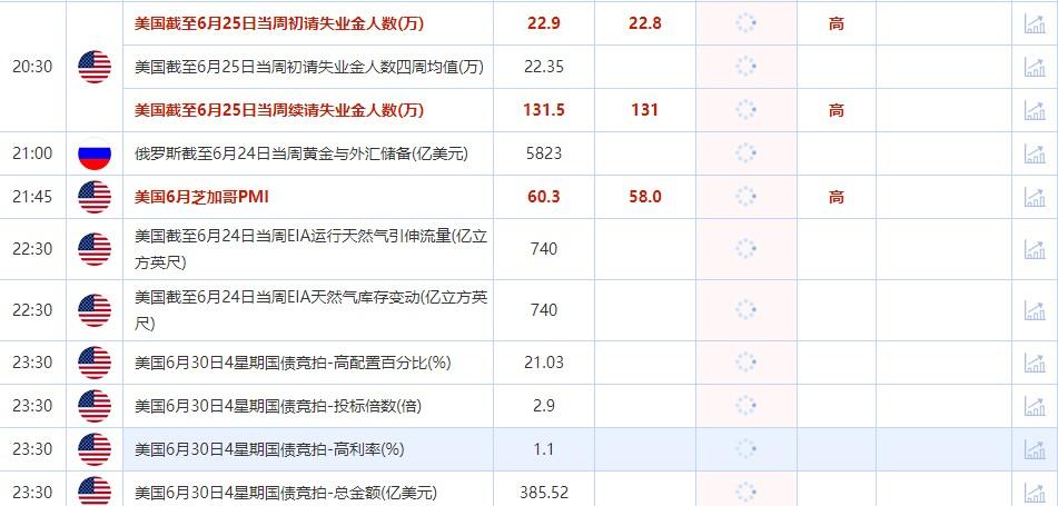 20:30 美国截至6月25日当周续请失业金人数(万) , 前值 131.5 , 预期值 131 , 公布值:待发布