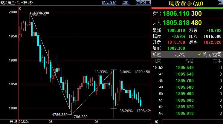 周四(6月30日),现货黄金破位下跌,创5月16日以来新低至1802.52美元/盎司,由于美元走强和各国央行的鹰派言论削弱了黄金的吸引力。各国央行决策者表示,抗通胀进程将是痛苦的,但必须迅速采取行动。