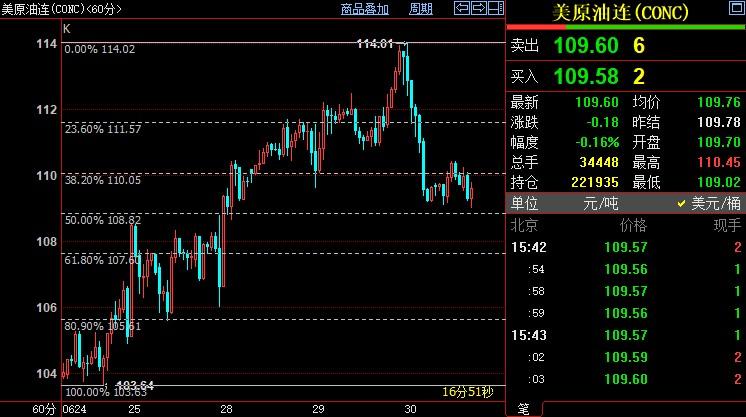 北京时间15:45,NYMEX原油期货下跌0.45%至109.29美元/桶;ICE布伦特原油期货下跌0.71%至115.43美元/桶。