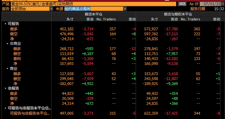 美国商品期货交易委员会(CFTC)数据显示,截至6月28日当周,COMEX黄金期货投机性净多头寸减少15180手至46637手,创近9个月以来新低;其中多头仓位减少3532手合约至121681手,空头仓位增加11647手至75044手合约。