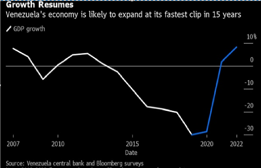 这个国家就是委内瑞拉。据媒体对五位经济学家的调查结果,他们预计今年委内瑞拉国内生产总值(GDP)将增长8.3%,远高于2021年的1.9%。石油产量的增加、税收收入和银行信贷的扩张,各个利好因素都在提振该国经济,国内需求正在持续上升。