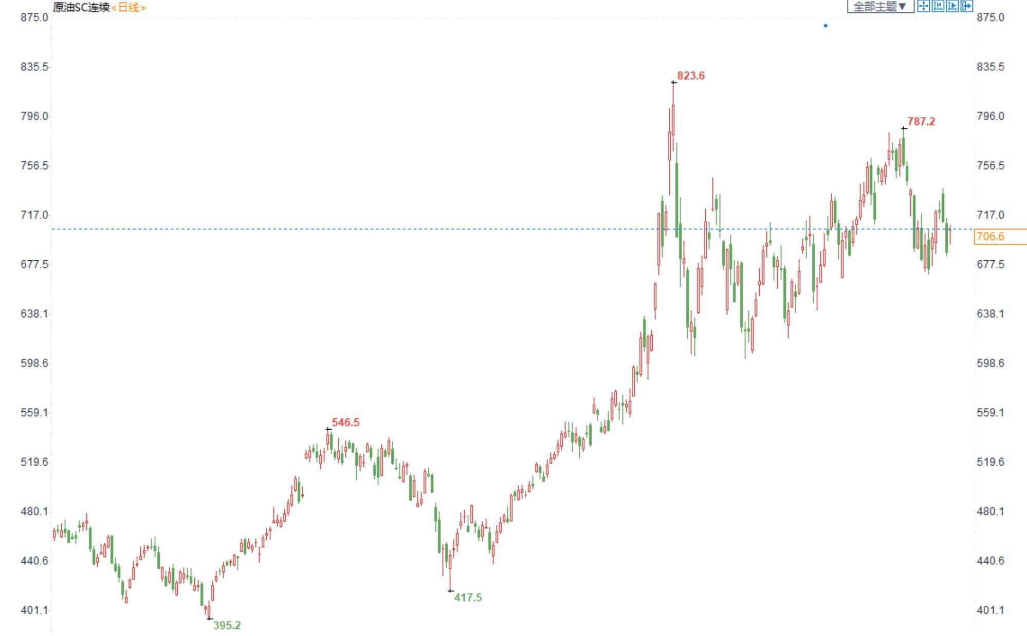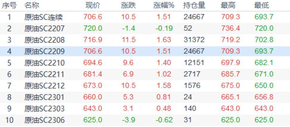 周一(7月4日)上海原油价格收盘上涨10.5元,跌幅1.51%。主力合约2209终盘收于706.6元/桶,涨10.5元/桶。油价收涨,主要因市场认为OPEC产能有限,供给仍然无法满足市场需求,支持了油价。