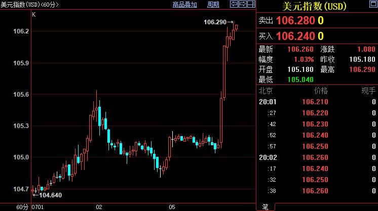 北京时间20:02,现货黄金下跌0.58%至1796.90美元/盎司;COMEX期金主力合约下跌0.24%至1797.0美元/盎司;美元指数上涨1.01%至106.242。
