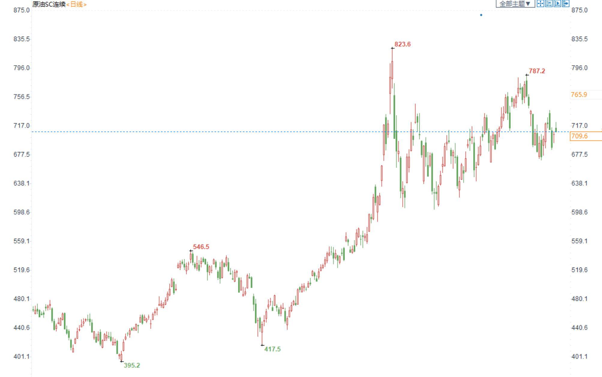 周二(7月5日)上海原油价格收盘小幅上涨8.3元,跌幅1.18%。主力合约2209终盘收于709.6元/桶,涨8.3元/桶。油价收涨,主要因有消息显示,挪威近海油气田工人罢工,这个油价短期走势带来了一些支持。另外,全球原油供给有限,始终长期给油价带来支持。