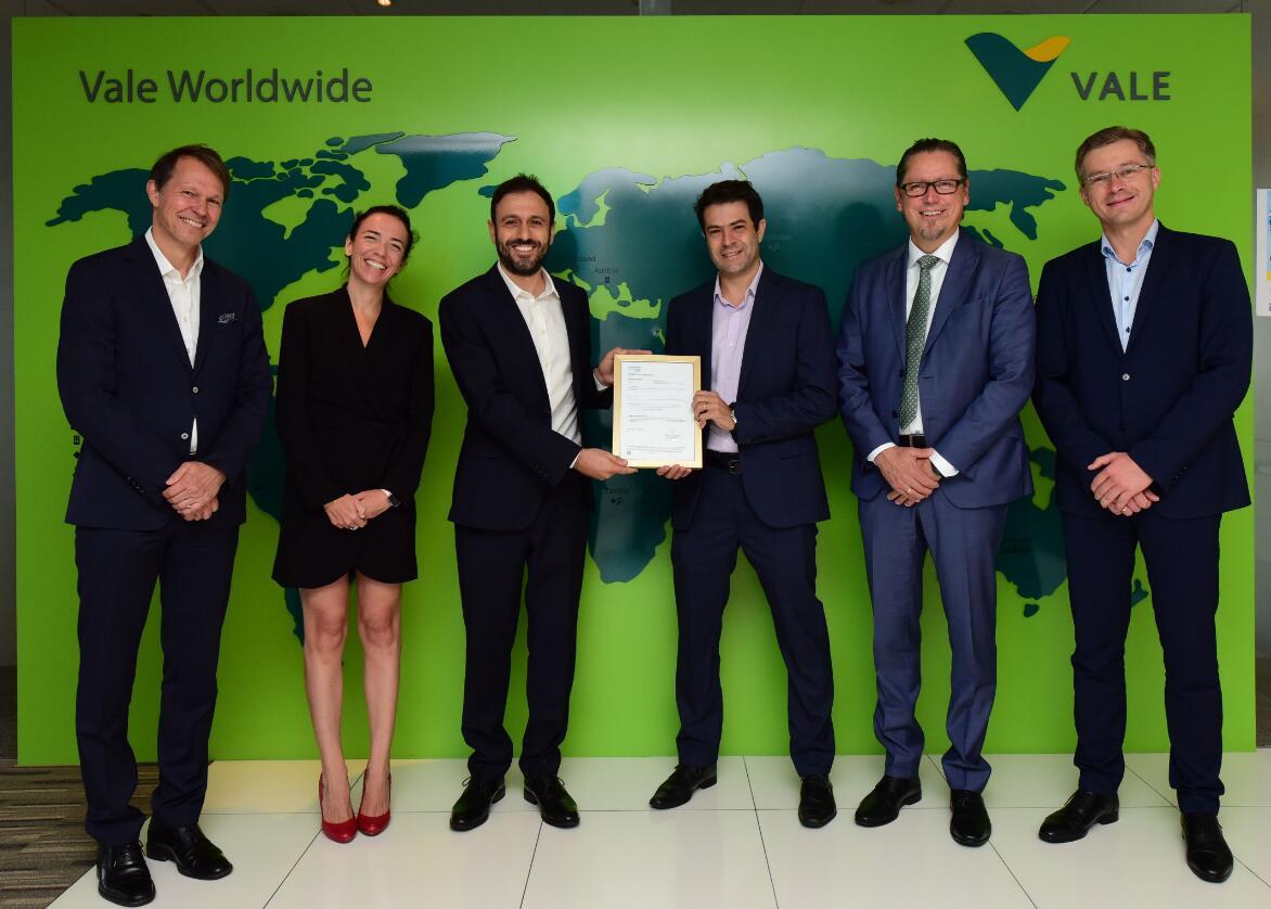 图:淡水河谷航运技术经理罗德里戈·贝梅里奥(左三)代表公司接受 DNV 的 AIP 认证