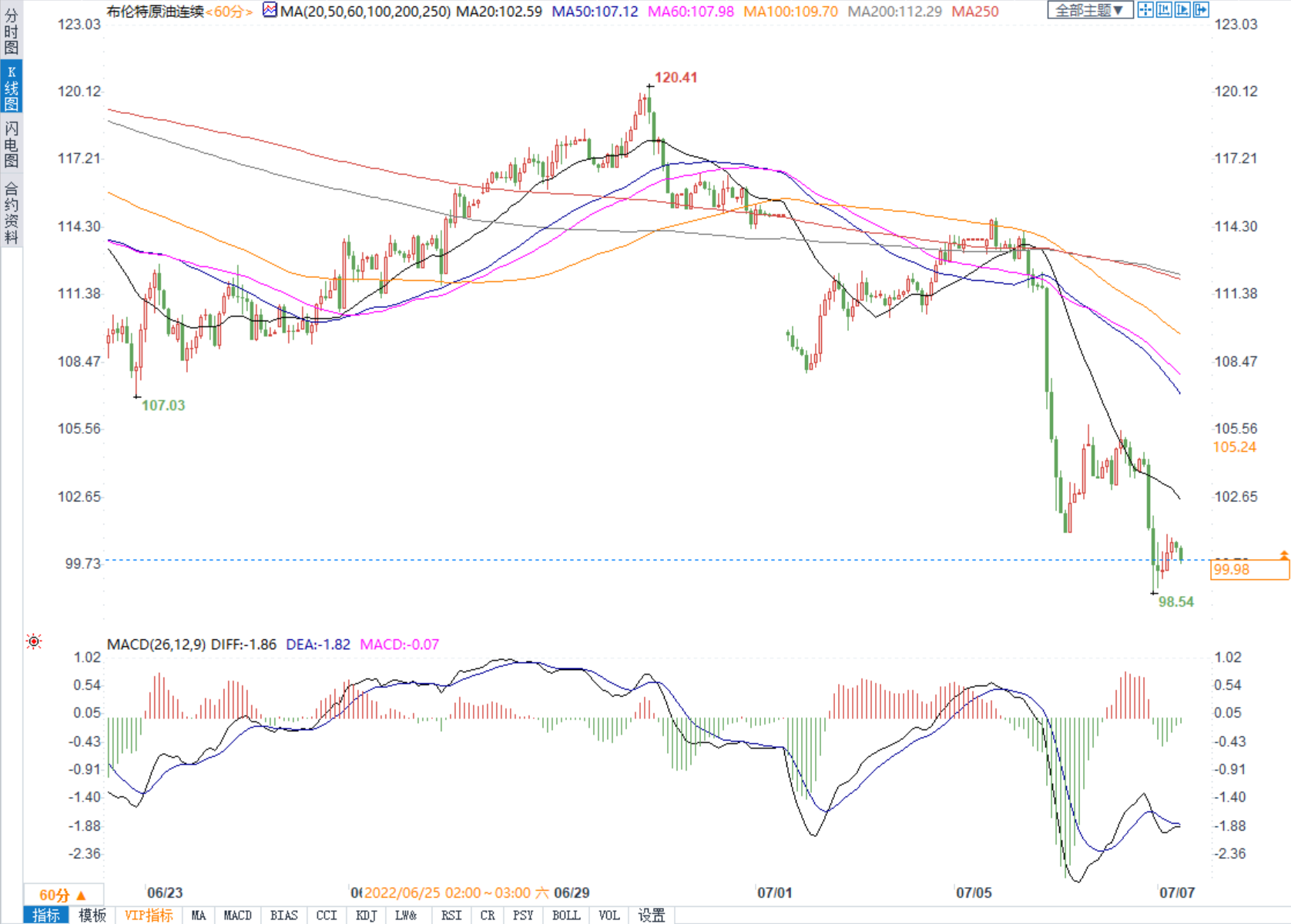 周三(7月6日)美油期货下跌1.0%,结算价报98.53美元,盘中波动区间达到7美元。盘中交投震荡,两大指标因供应担忧而一度上涨超过2美元,后又下跌超过4美元触及日低。原油期货几个月来一直极度波动。早前公布的API数据显示,截至7月1日当周,原油库存意外增加382.5万桶,汽油库存减少181.4万桶,精炼油库存减少63.5万桶。数据公布后,油价小幅走低。