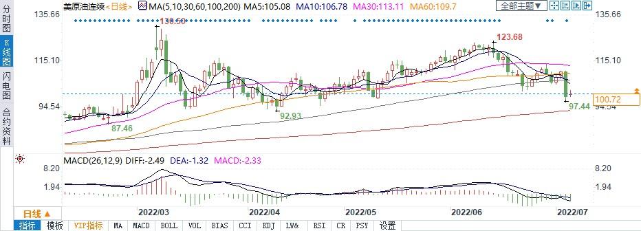 截至当日收盘,美国WTI8月原油期货收跌8.93美元,报99.50美元/桶,跌幅为8.24%;9月交货的伦敦布伦特原油期货价格下跌10.73美元,报102.77美元/桶,跌幅为9.45%。