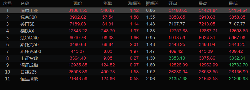 美股收盘情况,道琼斯工业指数上涨1.12%,报31384.55点;标普500指数上涨1.50%,报3902.62点,纳斯达克指数上涨2.28%,报11621.35点。