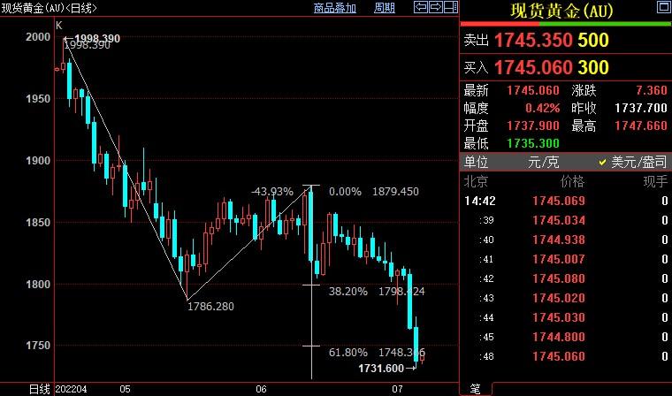 周四(7月7日),现货黄金小幅反弹,但距离上个交易日创下的2021年9月末以来新低1732.17美元/盎司不远。市场认为,金价反弹是暂时的,后市继续看跌,因全球增长担忧和美联储强硬态度将继续推高美元。