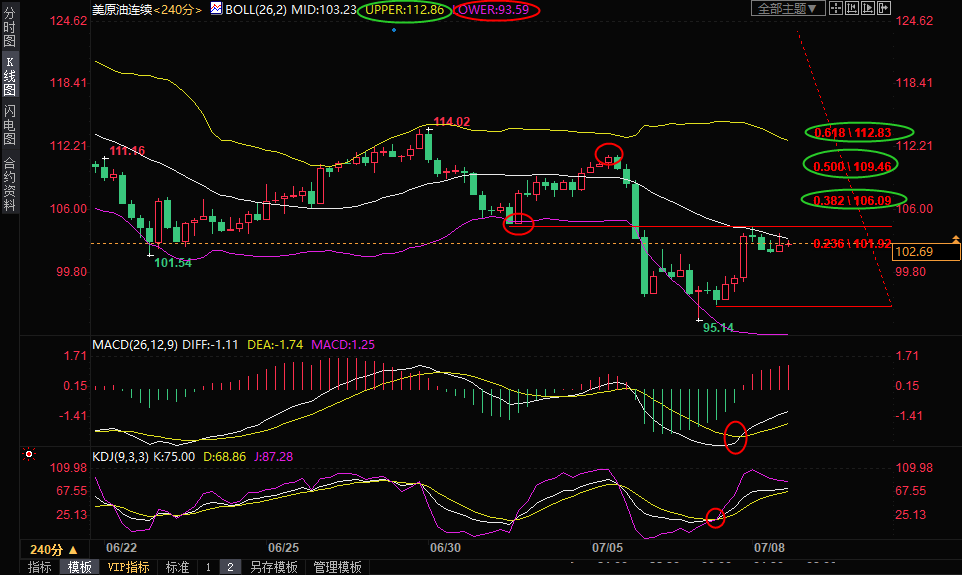 4小时级别:震荡下跌后反弹;MACD金叉运行,KDJ金叉,短线油价偏向震荡上涨,目前正试探104.56附近阻力,若能顶破该阻力,则有望进一步涨向布林线上轨112.86附近阻力,123.68-95.14跌势的61.8%回撤位阻力也在该位置附近,需要重点关注,可以作为中线走势的参考位置所在。
