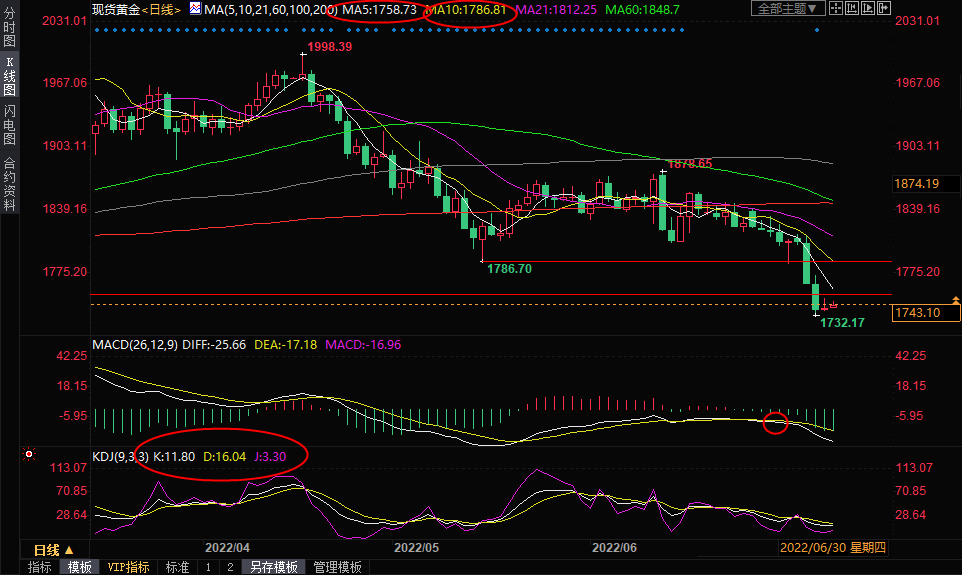 由于KDJ已经发出短线超卖信号,目前来看,金价有望在1700-1720区域获得支撑并震荡调整;上方初步阻力在1750整数关口附近,5日均线阻力1858.54附近,强阻力在10日均线1786.80附近,多头需要收复该位置,才能排除进一步下跌风险。