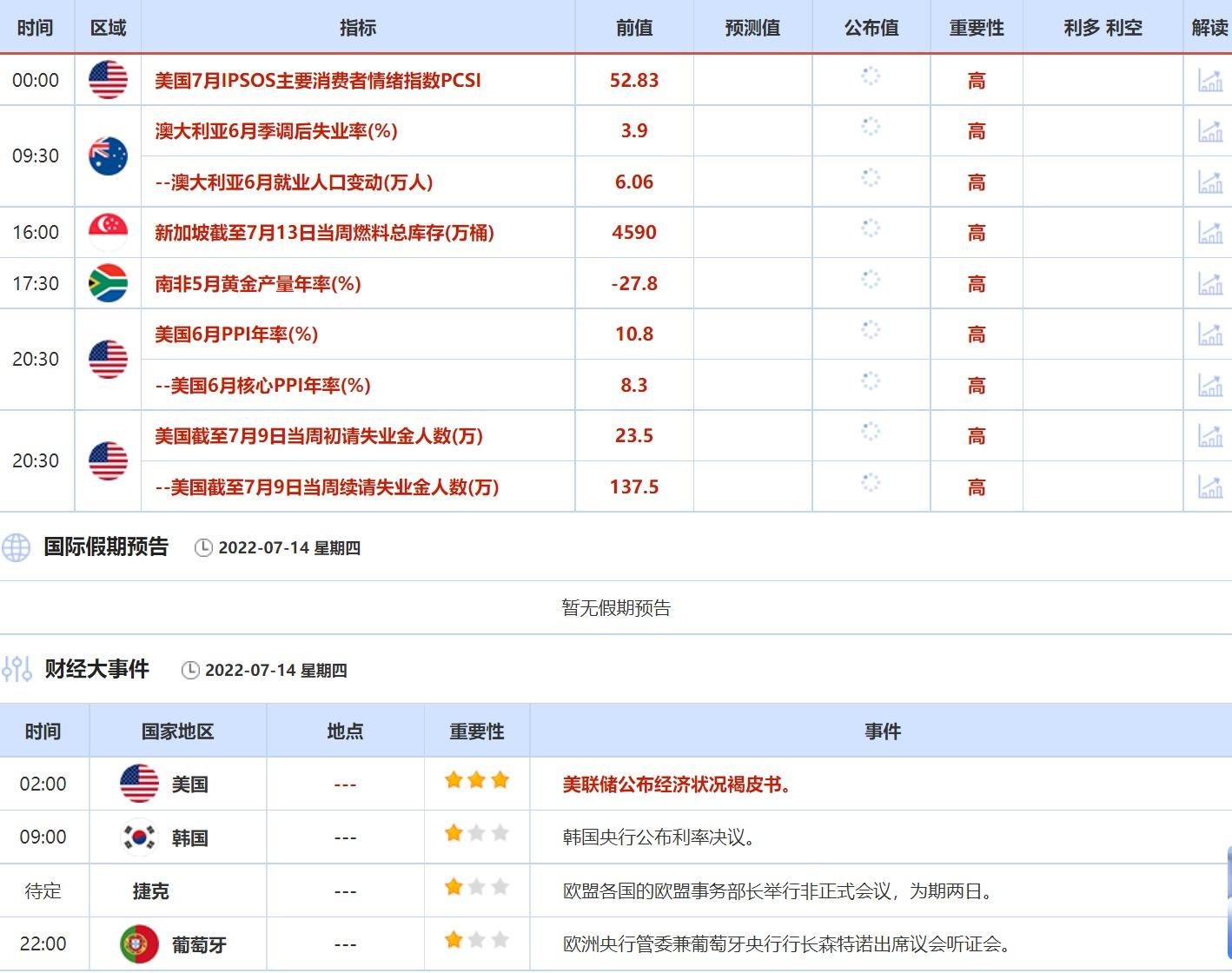 7月13日,新西兰联储公布利率决议和货币政策评估报告,加拿大央行公布利率决议。调查称,22位分析师中的20位表示,新西兰联储将于7月13日的会议上将基准利率上调50个基点至2.50%;2位认为会上调至2.25%。