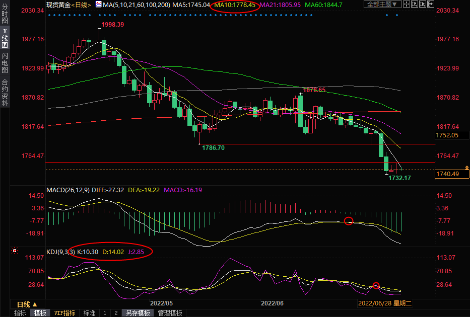 鉴于KDJ也发出了超卖信号,上周五K线录得了十字星,虽然位置并不理想,但还需提防金价再次探底后反弹回升的可能性,上周五高点阻力在1752.36附近,然后是1760整数关口附近阻力,10日均线阻力在1778.40附近,若能收复该位置,则增加后市看涨信号。
