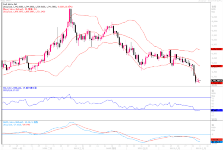 上周五晚间,美国劳工部公布的6月非农就业新增37.2万人,远超预期26.8万人,稍逊于5月的39万人。这不仅是非农增长连续第三次超出预期,而且是自今年2月以来超出预期最大的一次。这也表明当前美联储的动作引发经济放缓,但并未进入衰退。美联储沃勒表示,美联储在抗击通胀方面会全力以赴,遏制过热通胀是必要的,美联储需要转向更具限制性的政策,越早行动越好。同时他支持本月再次加息75个基点,并表示9月会议或许可以在加息50个基点。布拉德同时也表示,在7月的FOMC会议上加息75个基点很有道理,美联储的目标就能迅速达到中性水平。从周三公布的会议纪要可以发现,美联储准备将利率上调到比点阵图中预测更高的水平。最新点阵图显示美联储预计明年基准利率升至3.75%-4%的峰值。而且黄金ETF过去六个交易日出现持续减,持有量降至近四个月最低,这暗示金价仍有进一步下探风险。