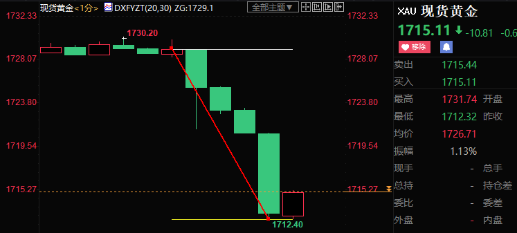 北京时间周三(7月13日)20:30,美国劳工部发布6月通胀报告,整体CPI创逾四十年新高,强化美联储激进加息立场。截至发稿,现货黄金跳水近17美元至1712.40美元/盎司。