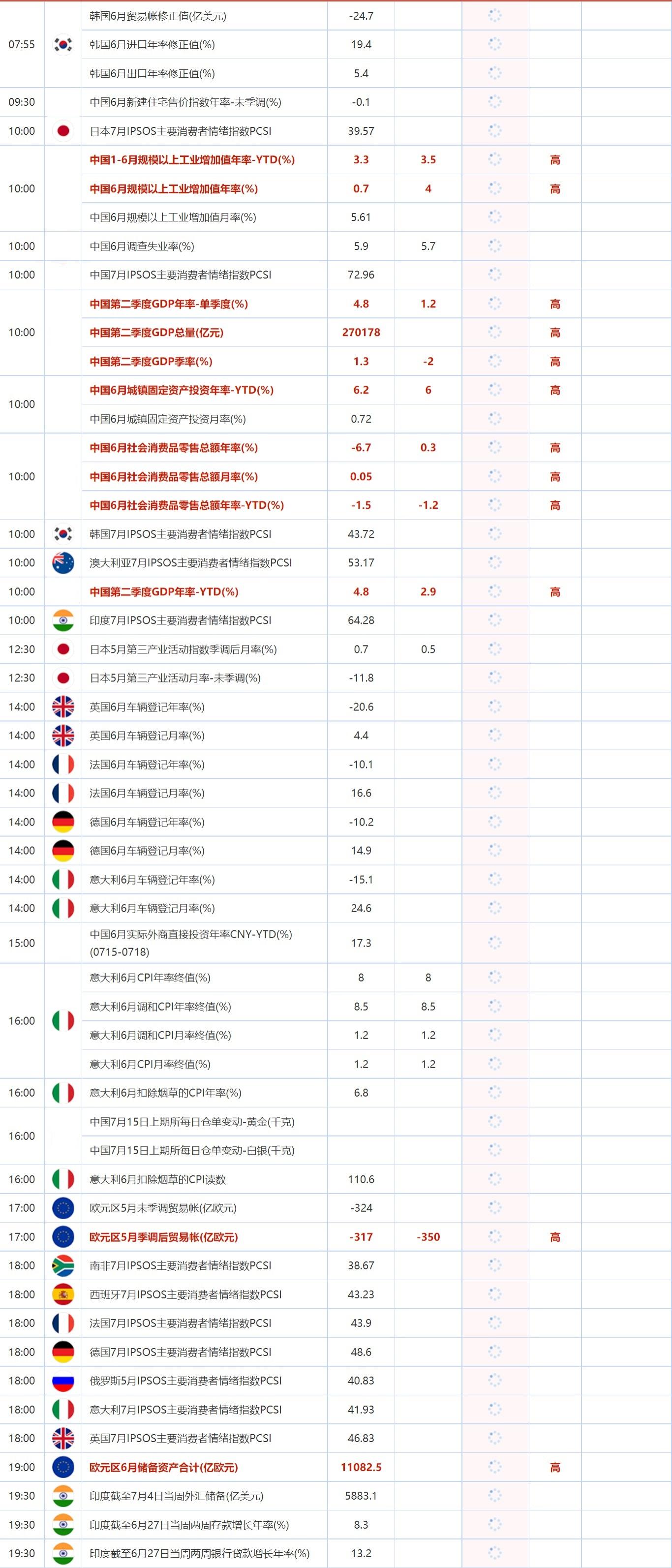 10:00 中国第二季度GDP年率-YTD(%) , 前值 4.8 , 预期值 2.9 , 公布值:待发布