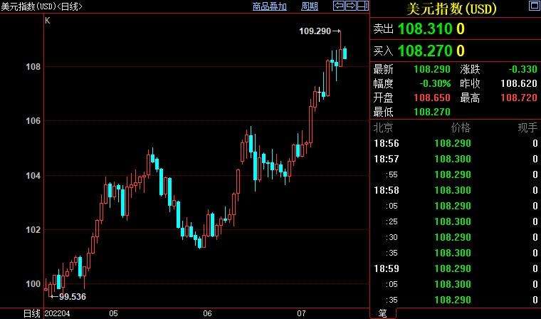 本周公布的美国通胀报告显示,6月份整体价格上涨速度同比升至9.1%,创逾40年新高。数据公布后,交易员押注美联储本月政策会议上加息幅度料扩大到100个基点。美联储官员随后对该预期进行降温,美指目前回落到109关口下方。