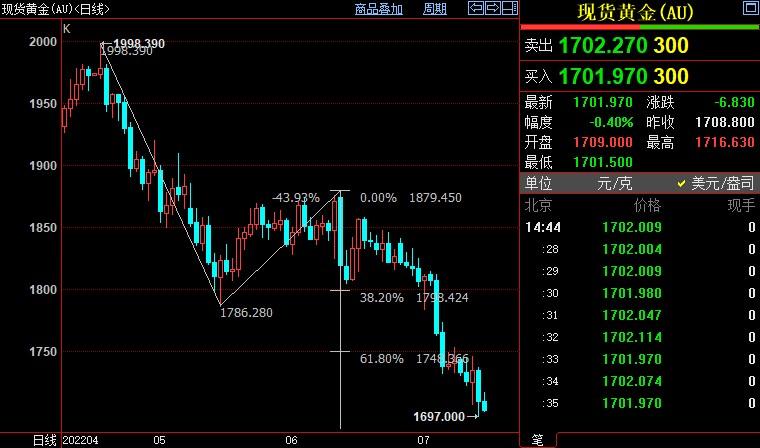 北京时间14:45,现货黄金下跌0.47%至1701.70美元/盎司;COMEX期金主力合约下跌0.38%至1699.3美元/盎司;美元指数上浮0.06%至108.705。