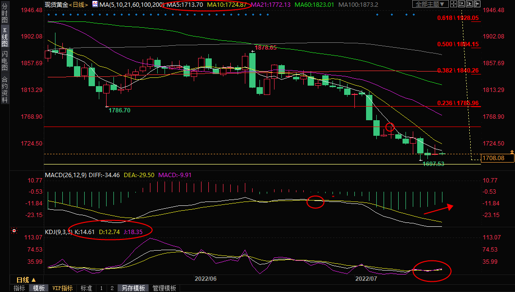 鉴于KDJ发出超卖信号后初步金叉,短线金价仍存在震荡反弹的机会;初步阻力在5日均线1713.81附近,10日均线阻力在1724.92附近,上周四高点阻力在1736.07附近;强阻力在7月8日高点1752.36附近,如果金价能够收复该位置,则增加后市看涨信号。
