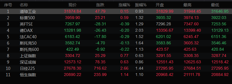 美股收盘情况,道琼斯工业指数上涨0.15%,至31874.84点;标普500指数上涨0.59%,至3959.9点;纳斯达克指数上涨1.58%,至11897.65。
