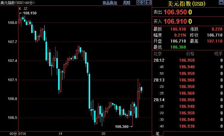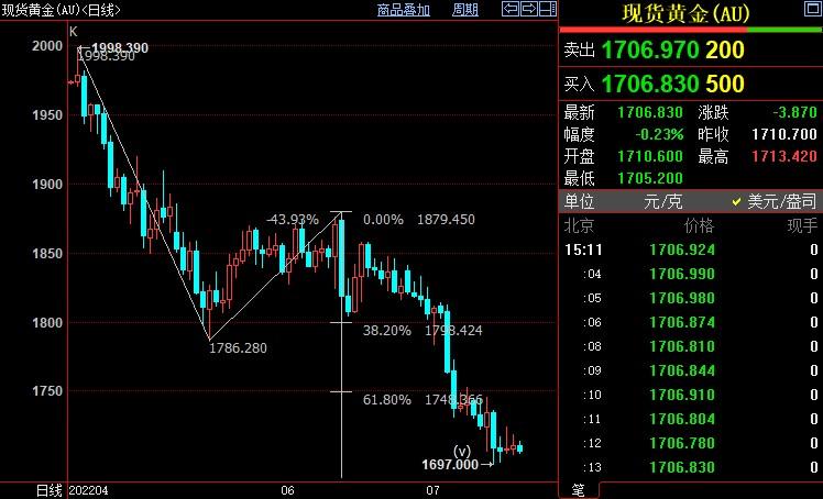 北京时间20:14,现货黄金下跌0.19%至1708.19美元/盎司;COMEX期金主力合约下跌0.26%至1706.2美元/盎司;美元指数上涨0.23%至106.947。