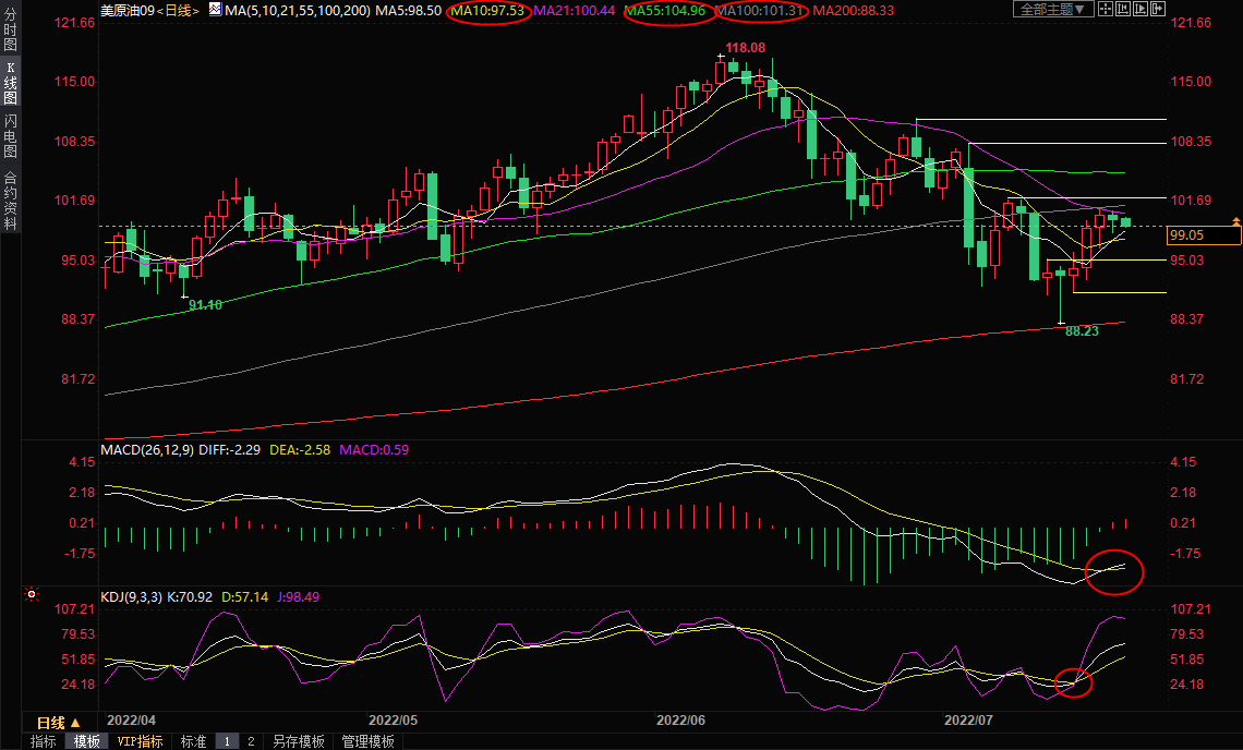 鉴于油价目前还受到100日均线压制,短线走势不确定性依然较大,若油价回落至10日均线97.54下方,则需要提防重回跌势的风险,进一步支撑在7月13日高点95.34附近,7月15日低点支撑在91.64附近,一旦失守该支撑,则增加短线看空信号。
