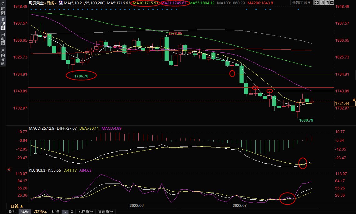 日线级别:单边下跌后低位震荡;MACD金叉运行,KDJ金叉运行,短线略微偏向多头,留意21日均线1745.67附近附近(7月13日高点阻力也在该位置附近),若能顶破该阻力,则增加短线看涨信号,进一步阻力在7月8日高点1752.36附近,2021年12月15日低点阻力也在该位置附近,然后是1760关口,强阻力在5月16日低点1786.70附近。