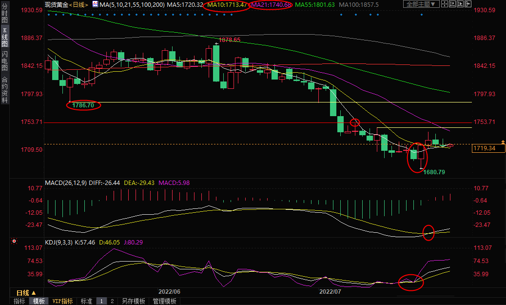 不过,金价连续三个月交易日未能顶破21日均线阻力,而且高点逐日降低,短线金价也面临一定的下探风险,10日均线支撑在1713.40附近,关键支撑在1700关口附近,若失守该支撑,则增加短线看空信号,7月20日低点支撑在1692.35附近。