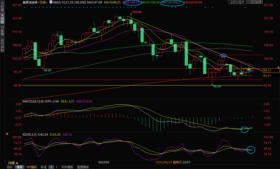 日线级别:震荡;MACD轻微金叉,KDJ死叉被破坏,200日均线给油价提供良好支撑,失守200日均线94.94前,短线油价偏向震荡上涨,初步阻力在21日均线99.79附近,也可以参考100整数关口,进一步阻力在布林线中轨101.54附近,若能顶破该阻力,则增加短线看涨信号;然后是7月19日高点104.43附近阻力,强阻力在100日均线106.37附近。